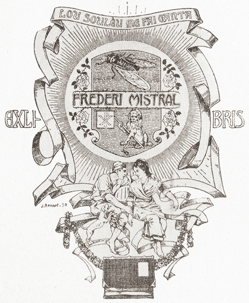 L’ex-libris mistralien repose sur une gloire de rayons de soleil. Il est formé du blason félibréen du maître : d’azur, à la cigale d’or, en chef, et des armes parlantes de la ville d’Arles, en pointe : d’azur au loin assis d’or, tenant de la dextre un labarum du même, portant pour légende un P et un X entrelacés.