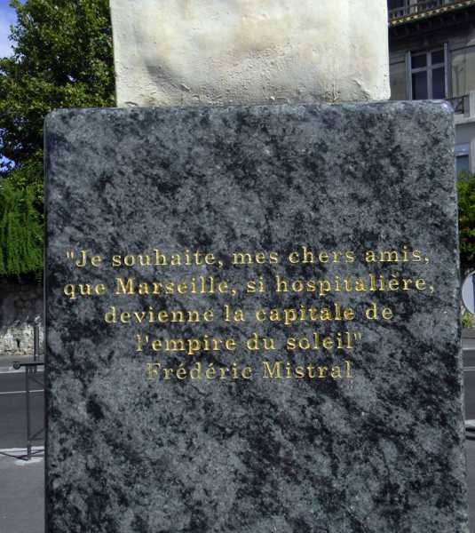 Pour comble d’ironie, il est gravé en lettres d’or, à l’arrière de la colonne, une phrase, traduite en français, extraite du discours que fit Mistral le 25 novembre 1882, au cercle artistique, aujourd’hui, lycée Montgrand : "Je souhaite, mes chers amis, que Marseille, si hospitalière, devienne  la capitale de l’empire du soleil."