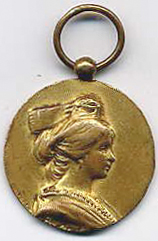 1903 - La première médaille, à l’image de la jeune et belle héroïne provençale, voit le jour sous les ciselets du sculpteur médailleur brestois Ferdinand Gilbault, (1837-1926). Montée en broche, en argent massif (sauf l'épingle), la médaille porte 2 poinçons : tête de sanglier et poinçon de maître orfèvre illisible, plus les initiales CL, sans doute celles du fondeur. La remise de ce bijou et d’un diplôme dessiné par Léo Lelée se fit le 17 mai 1903, dans une étroite salle de l’ancien Museon arlaten, au deuxième étage du Tribunal de Commerce, à Arles. 28 demoiselles, entouraient Frédéric Mistral. L’année suivante, le 4 avril 1904, lors de la deuxième Fèsto Vierginenco, au théâtre antique d’Arles, plus de 300 « Chato ». étaient réunies pour recevoir le beau diplôme et la précieuse médaille des mains du Maître.