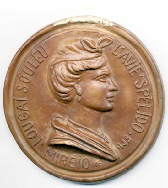 1954 - Santonnier à Saumane-de-Vaucluse dès 1929, mais aussi félibre, Joseph Montagard (1900-1992) créée en commémoration du « Centenaire du Félibrige » (1954), deux médailles : l’une représente F. Mistral, la seconde un profil droit de Mirèio autour duquel : Lou gai soulèu L’aviè’spelido.