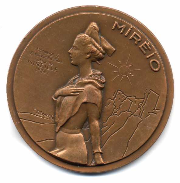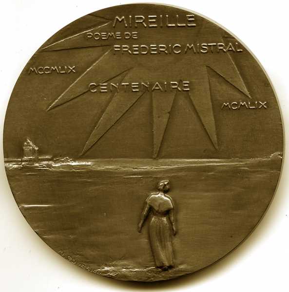 Emise en bronze 65 x 55 mm de forme dite “roman”, on lit sur l’avers : A Frederi Mistral ses amis ses admirateurs. Sur le revers, le graveur présente “Mireille” marchant vers les Saintes-Maries-de-la-Mer. A l’horizon se détache l’Eglise sanctuaire. Dans le ciel ensoleillé cet extrait du Chant X de Mirèio :