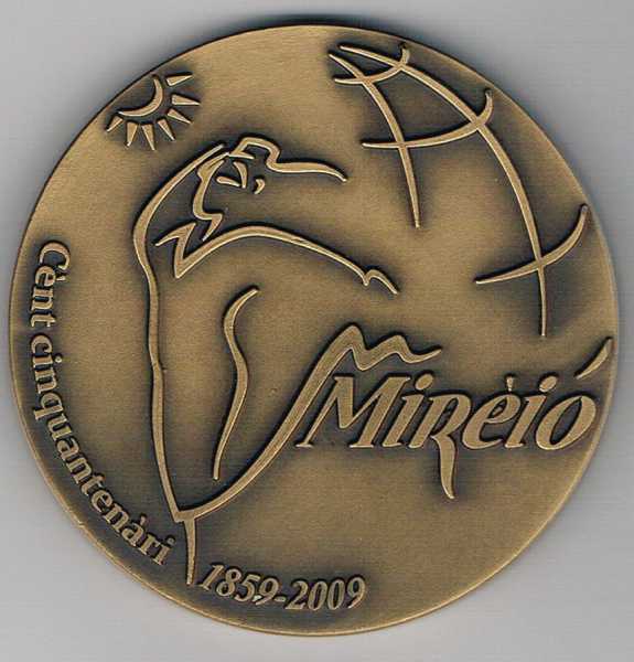 2009 - Enfin, la dernière médaille Mireille réalisée, fut celle de 2009, en commémoration du Cent cinquantenaire du poème Mirèio. Cette jolie pièce en bronze orfèvrerie, de 70 mm de diamètre et de 5 mm d’épaisseur, au graphisme moderne, fut éditée en 2D par le Félibrige. Elle se présente dans un écrin soigné et devient un souvenir attachant pour les mainteneurs.